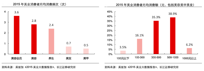 經(jīng)典案例:根據(jù)美麗加《2015美業(yè)大數(shù)據(jù)報告》、長江證券研究所等綜合資訊表明,月均 2-3 次的較高進(jìn)店頻次,使得顧客與美容師的粘性和品牌信賴度逐步提升后有更大 幾率嘗試高階項目;月均 300-1000 元的消費(fèi)額,線性外推得到全年消費(fèi)額約 4000- 12000 元,屬于典型的中產(chǎn)階級的生活品質(zhì)升級類消費(fèi)價格帶,亦有一定向上開拓空間。