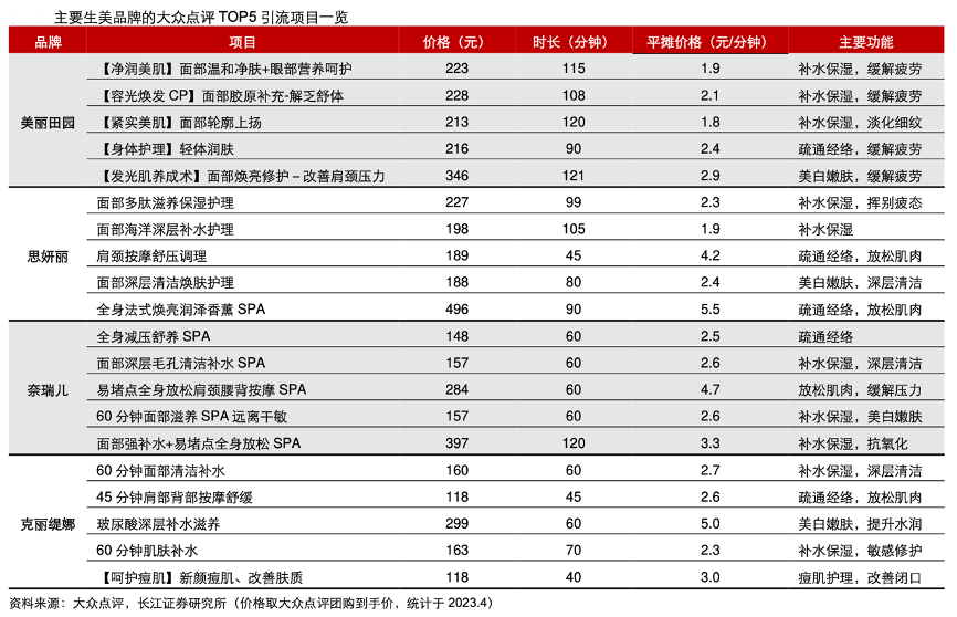 經(jīng)典案例:根據(jù)大眾點(diǎn)評、長江證券研究所等綜合資訊表明,美麗田園、思妍麗、奈瑞兒和克麗緹娜在大眾點(diǎn)評上主要陳列補(bǔ)水保濕、清潔、緩解疲勞類等基礎(chǔ)功效團(tuán)購項目,到手價集中于 100-300 元之間,項目服務(wù)時間集中于 1-2h,從而減輕新客嘗鮮的資金成本和心理負(fù)擔(dān),同時提供更充分的體驗時間,相對同質(zhì)化的引流項目,使品牌方能夠更廣泛地覆蓋并觸達(dá)潛在客群。