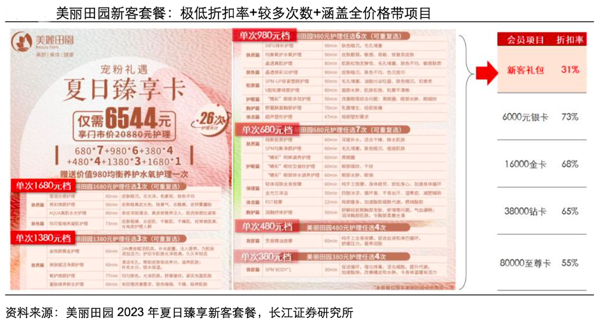 經(jīng)典案例:根據(jù)美麗田園2023年夏日臻享新客套餐、長江證券研究所等綜合資訊表明,以美麗田園新客禮包為例,其涵蓋多次數(shù)(26 次)+全 價格帶(單次 380-1680 元項目全覆蓋)項目的同時給予新客 31 折的極低折扣率,甚至 低于會員至尊卡的 55 折最低折扣,盡可能降低新客嘗鮮的資金成本,將消費(fèi)者注意力牽引至服務(wù)質(zhì)量和體驗感本身,以此區(qū)分出購買力、護(hù)膚需求與品牌相符的核心客群。