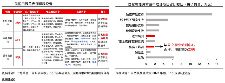 經(jīng)典案例:根據(jù)上海美麗田園培訓(xùn)學(xué)校、自然美加盟政策2023年版、長江證券研究所等綜合資訊表明,美麗田園于 2005 年在上海市成立美麗田園培訓(xùn)中心,2010 年進(jìn)一步擴(kuò)建為上海美麗田園培訓(xùn)學(xué)校;克麗緹娜于 2002 年在上海設(shè)立培訓(xùn)中心,2012年進(jìn)一步擴(kuò)建為哲美培訓(xùn)學(xué)院。以美麗田園為例,其產(chǎn)品中約 90%來自進(jìn)口,主要精力放在服務(wù)體系搭建上;對比來看,自然美加 盟方案中,品牌方的主要需求為加盟店帶動產(chǎn)品出貨,培訓(xùn)相關(guān)項目價值量占比不到 10%,且采用委外模式,培訓(xùn)期不到 1 個月(23 天),相比之下員工技能提升可能較慢。