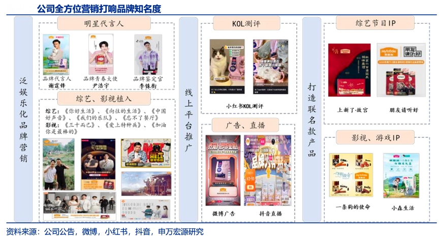 經(jīng)典案例:根據(jù)公司公告、微博、小紅書、抖音、申萬宏源研究等綜合資訊表明,乖寶寵物主要通過聘請明星代言人、在紀錄片、綜藝及影視作品中植入品牌宣傳、贊助動物公益活動等方式。具體措施有:邀請知名歌手、演員如謝霆鋒 擔任公司形象代言人;引入海外紀錄片和真人秀節(jié)目,打造品牌形象并推銷優(yōu)秀產(chǎn)品等。