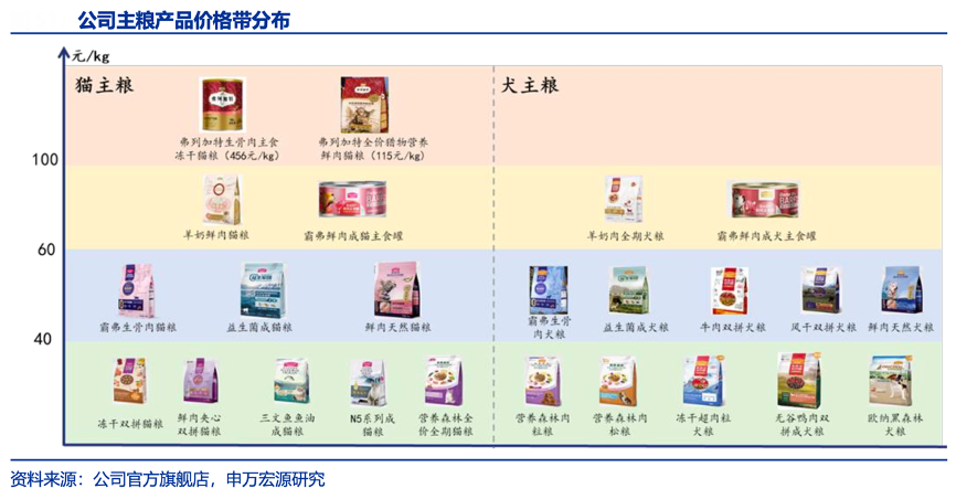 經(jīng)典案例:根據(jù)公司官方旗艦店、申萬宏源研究等綜合資訊表明,乖寶寵物公司主糧產(chǎn)品包括多 個系列,且不同系列定位差異化明顯,主糧產(chǎn)品涵蓋 40 元/kg 以下、40-60 元/kg、60-100 元/kg 和 100 元/kg 以上等多個價格帶,產(chǎn)品矩陣豐富,覆蓋多層次消費 人群。2018年以來,隨著公司“弗列加特”系列等高端產(chǎn)品營收占比的提高,以及公司品牌力的日趨凸顯,公司主糧平均銷售單價持續(xù)上行,由 10.03 元/千克上升至 14.27 元/ 千克。