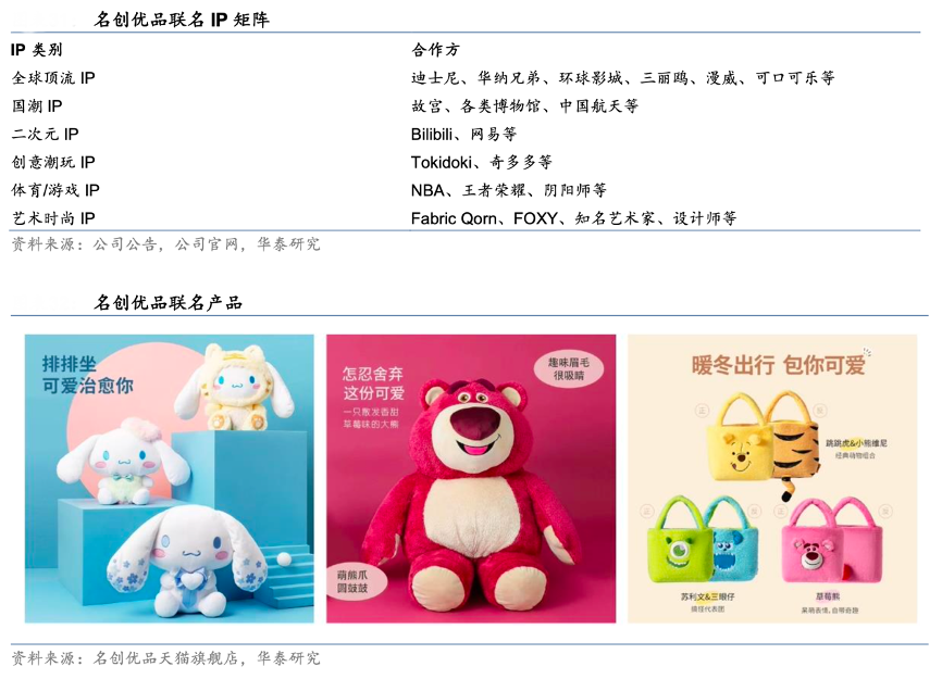 經(jīng)典案例:根據(jù)公司公告、公司官網(wǎng)、名創(chuàng)優(yōu)品天貓旗艦店、華泰研究等綜合資訊表明,2016 年以來名創(chuàng)優(yōu)品陸續(xù)和粉紅豹、Hello Kitty、芝麻街、Universal、迪士尼、故宮、NBA、漫威、中國航天、陰陽師、Bilibili 等知名 IP 推出聯(lián)名產(chǎn)品,截至 2023 年 6 月 30 日,名創(chuàng)優(yōu)品已與 82 個 IP 進行聯(lián)名合作。
