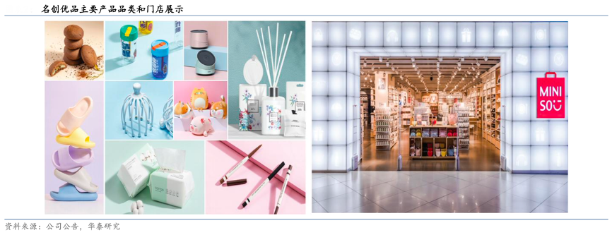 經(jīng)典案例:根據(jù)公司公告、華泰研究等綜合資訊表明,名創(chuàng)優(yōu)品面向消費者提供 11 大類生活日用品,涵蓋生活家居、小型電子產(chǎn)品、紡織品、包袋配飾、 美妝工具、玩具、彩妝、個人護理、零食、香水、文具和禮品,其中大部分為自有品牌產(chǎn)品。FY2022-FY2023(公司財政年度以 630 為限),名創(chuàng)優(yōu)品品牌每月平均推出 530 個SKU, 為消費者提供超過 9,700 個核心 SKU(連續(xù) 12 個月的累計銷售額超過 10 萬元)產(chǎn)品。