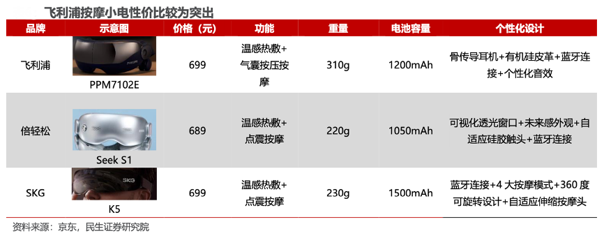 經(jīng)典案例:根據(jù)京東、民生證券研究院等綜合資訊表明,飛利浦按摩小電不僅具備先進(jìn)的技術(shù),更注重產(chǎn)品的性價(jià)比。以飛利浦旗下最暢銷產(chǎn)品眼部按摩儀 PPM7102E 為例,該產(chǎn)品凈重 310g,與同價(jià)位段的友商按摩儀產(chǎn)品相比,除了集合熱敷、按摩等基本功能外,還添加了骨傳導(dǎo)耳機(jī)和個(gè)性化音效等同價(jià)位段產(chǎn)品所不具備的功能,力求以相同的價(jià)格為消費(fèi)者帶來除傳統(tǒng)眼部按摩外的個(gè)性化體驗(yàn)。
