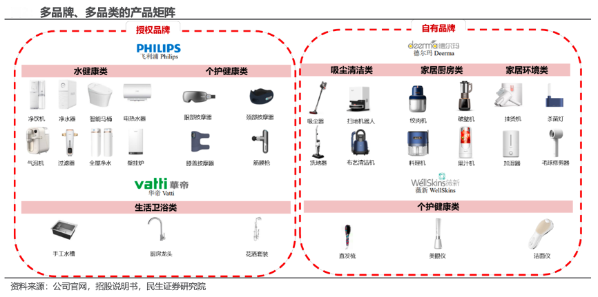 經(jīng)典案例:根據(jù)公司官網(wǎng)、招股說明書、民生證券研究院等綜合資訊表明,德爾瑪公司建立了成熟的品牌矩陣,通過不同品牌覆蓋不同品類產(chǎn)品,切入不同的消費(fèi)場景。其中,自有品牌 “德爾瑪”主要覆蓋吸塵清潔類、加濕環(huán)境類以及家居廚房類等家居環(huán)境類產(chǎn)品;“飛利浦”品牌主要覆蓋水健康類及個(gè)護(hù)健康類等產(chǎn)品。