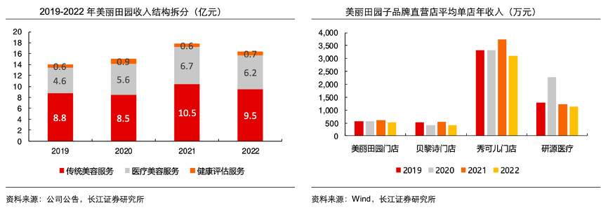 經典案例:根據(jù)公司公告、wind、長江證券研究所等綜合資訊表明,2022 年,美麗田園公司醫(yī)美業(yè)務收入達 6.2 億 (占比 38%),相較 2019 年復合增長 10.1%,高于生美業(yè)務的 2.6%,雙美業(yè)態(tài)歷經疫情三年收入仍維持正增且體量趨同,其核心在于多年深耕直營所積累的強大門店管理能力孵化出創(chuàng)收能力突出的優(yōu)質單店,生美單店平均年收入中樞 500 萬左右,醫(yī)美單店年 均收入已高達 3000-3500 萬元,兩條腿走路模式逐步成型。