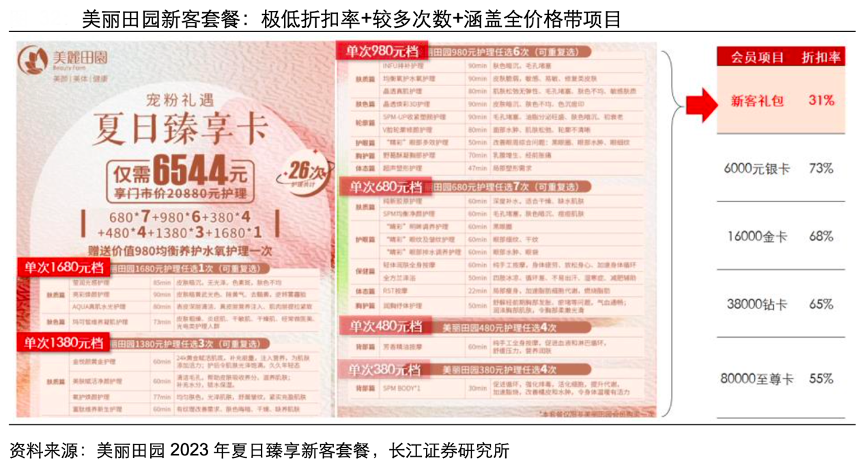 經(jīng)典案例:根據(jù)美麗田園2023年夏日臻享新客套餐、長江證券研究所等綜合資訊表明,以美麗田園新客禮包為例,其涵蓋多次數(shù)(26 次)+全 價格帶(單次 380-1680 元項目全覆蓋)項目的同時給予新客 31 折的極低折扣率,甚至 低于會員至尊卡的 55 折最低折扣,盡可能降低新客嘗鮮的資金成本,將消費者注意力 牽引至服務(wù)質(zhì)量和體驗感本身,以此區(qū)分出購買力、護膚需求與品牌相符的核心客群。