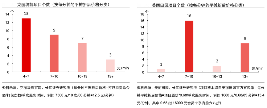 經(jīng)典案例:根據(jù)克麗緹娜官網(wǎng)、美麗田園、長江證券研究所等綜合資訊表明,從高階項目每分鐘平攤折后價格來看,克麗緹娜主要按 10 次項目打包價出售,計算“打包消費總金額/打包次數(shù)/單次服務(wù)時間”即得到每分鐘平攤折后價格,其多數(shù)項目為 4-10 元/ 分鐘;而美麗田園主要按會員充值打折的銷售方式,計算項目原價*中等級別折扣/單次服務(wù)時間,發(fā)現(xiàn)其多數(shù)項目為 7-10 元/分鐘以及 13 元+/分鐘,實際價格明顯更高一些。