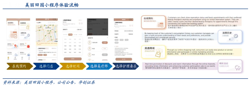 經(jīng)典案例:根據(jù)美麗田園小程序、公司公告、華創(chuàng)證券等綜合資訊表明,當(dāng)前美麗田園公司數(shù)據(jù)平臺(tái)涉及區(qū)域發(fā)展模型、門店運(yùn)營(yíng)支持模型、 客戶分析模型、員工發(fā)展模型,其中客戶關(guān)系管理系統(tǒng)中涵蓋 96 項(xiàng)客戶標(biāo)簽,用戶畫像 完整,利于挖掘客戶需求(如生美和醫(yī)美相互賦能)和喚醒沉睡客戶。2020 年初公司上線“美田在線”小程序,涵蓋線上預(yù)約、信息發(fā)布、營(yíng)銷活 動(dòng)、直播體驗(yàn)、線上商城、服務(wù)回訪等,實(shí)現(xiàn)從預(yù)約→消費(fèi)→服務(wù)反饋的閉環(huán)。