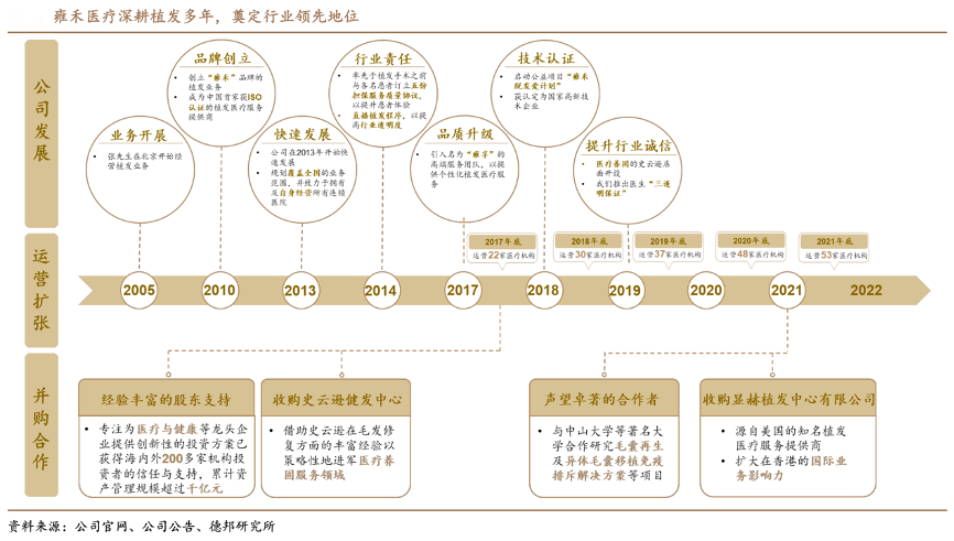 經典案例:根據公司官網、公司公告、德邦研究所等綜合資訊表明,雍禾醫(yī)療雍禾醫(yī)療深耕植發(fā)多年,奠定行業(yè)領先地位。憑借雍禾的醫(yī)療服務能力及史云 遜養(yǎng)發(fā)經驗,公司拓展療養(yǎng)固服務領域,以“店中店”模式設立史云遜健發(fā)中心,并于 2021 年 5 月收購顯赫植發(fā)的香港業(yè)務,同時公司與中山大學等機構合作研發(fā),增強核心競爭力。