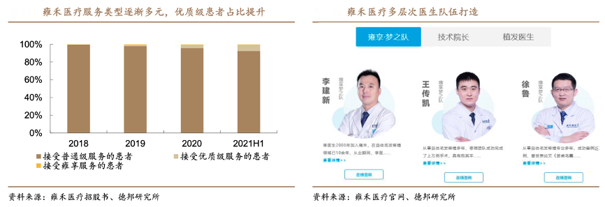 經(jīng)典案例:根據(jù)雍禾醫(yī)療招股書(shū)、雍禾醫(yī)療官網(wǎng)、德邦研究所等綜合資訊表明,雍禾醫(yī)療醫(yī)療植發(fā)建立三層等級(jí)服務(wù)體系,以滿(mǎn)足患者的多樣化需求。公司提供三 級(jí)根據(jù)醫(yī)生經(jīng)驗(yàn)及技能加以區(qū)分的植發(fā)醫(yī)療服務(wù),包括:1)普通級(jí)服務(wù):針對(duì)接 受標(biāo)準(zhǔn)植發(fā)手術(shù)的患者,收取人民幣 2 萬(wàn)元至 3 萬(wàn)元;2)優(yōu)質(zhì)級(jí)服務(wù):針對(duì)院長(zhǎng)、主任或副主任進(jìn)行升級(jí)和定制化植發(fā)手術(shù)的患者,收取 3 萬(wàn)元至 5 萬(wàn)元;3)貴賓級(jí)雍享服務(wù):針對(duì)接受由業(yè)內(nèi)知名植發(fā)專(zhuān)家進(jìn)行個(gè)性化植發(fā)手術(shù)的患者,收取逾 10 萬(wàn)元。