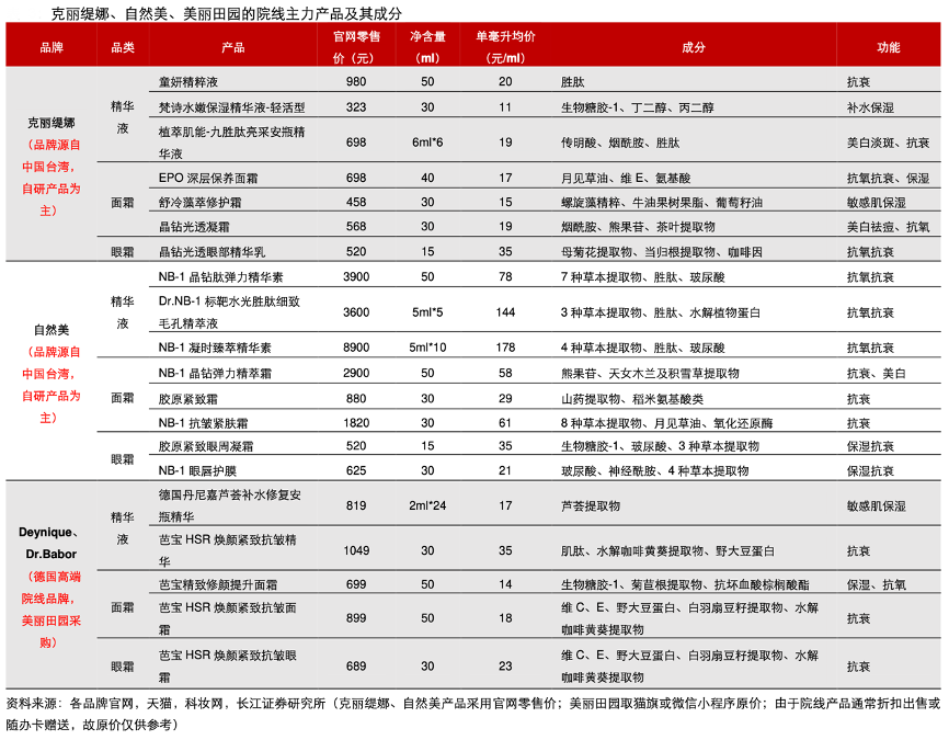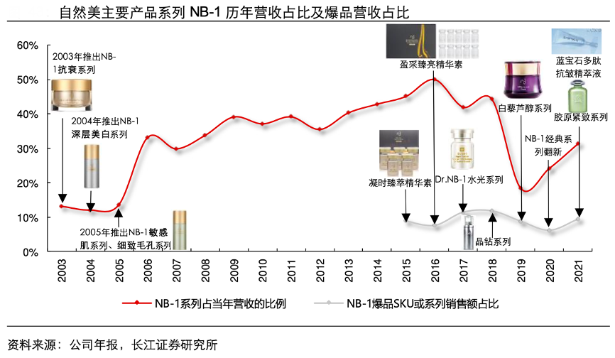 經(jīng)典案例:根據(jù)公司年報(bào)、長(zhǎng)江證券研究所等綜合資訊表明,以自然美為例,院線產(chǎn)品驅(qū)動(dòng)擴(kuò)張的模式或已進(jìn)入瓶頸期。臺(tái)資品牌自然美于 1993- 2006 基于“自研產(chǎn)品+加盟推廣”的模式在內(nèi)地快速拓店,在市場(chǎng)開(kāi)拓初期,其核心產(chǎn) 品 NB-1 系列隨著抗衰、美白、敏感肌修護(hù)等核心功效品類補(bǔ)齊,銷(xiāo)售額占比穩(wěn)步攀升,單品高識(shí)別轉(zhuǎn)導(dǎo)至消費(fèi)者品牌認(rèn)知度的強(qiáng)化。