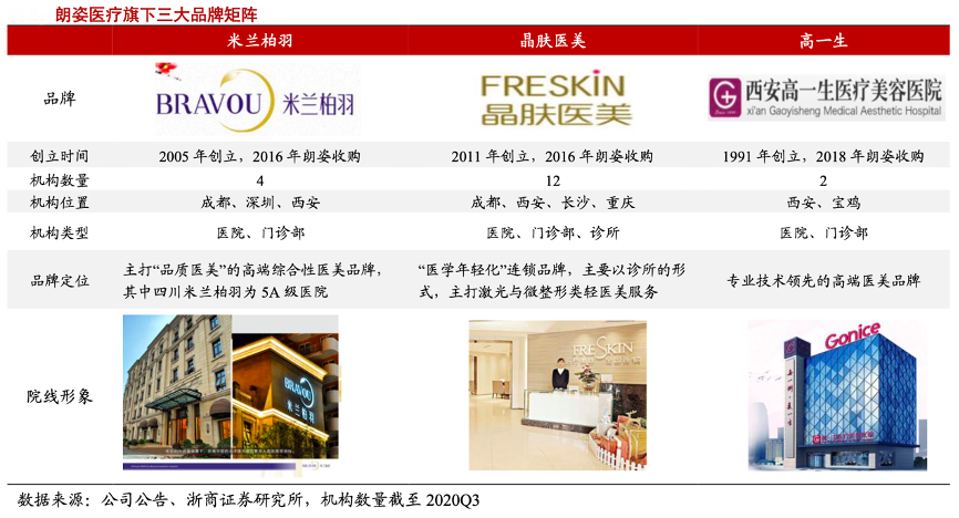 經(jīng)典案例:根據(jù)公司公告、浙商證券研究所等綜合資訊表明,2016年朗姿切入醫(yī)美賽道,三大事業(yè)部各具特色。2017年公司成立全資子公司朗姿醫(yī)療用于統(tǒng)籌醫(yī)美業(yè)務(wù)運(yùn)營和管理,目前朗姿醫(yī)療旗下?lián)碛忻滋m柏羽、晶膚醫(yī)美、高一生三大事業(yè)部,分別定位高端/輕醫(yī)美/專業(yè)技術(shù),2019年朗姿醫(yī)療收入/凈利潤/歸母凈利體量達(dá)到6.3/0.87/0.52 億元。
