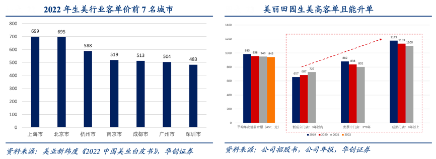 經(jīng)典案例:根據(jù)美業(yè)新緯度、公司招股書、公司年報(bào)、華創(chuàng)證券、等綜合資訊表明,傳統(tǒng)美容服務(wù)的客單價(jià)在400 元至 1500 元 之間,中高端客戶的客單價(jià)在 800 元至 1500 元。美麗田園布局中高端商場,定位中高端客戶,以上海為例,美麗田園在恒隆廣場、萬象城、K11、BFC 外灘金融中心、久光中心等高端商場均有布局,基于此,美麗田園 ASP 較高,2022 年為 943 元。且伴隨門店爬 坡,美麗田園具備升單能力,2021年新成立門店(3 年以下門店)、發(fā)展中門店(3~8 年)、成熟門店(8 年以上門店)的 ASP 分別為 727、802、1100 元,高于上海平均客單699 元。