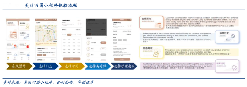 經(jīng)典案例:根據(jù)公司公告、美麗田園小程序、華創(chuàng)證券等綜合資訊表明,美麗田園當(dāng)前公司數(shù)據(jù)平臺(tái)涉及區(qū)域發(fā)展模型、門(mén)店運(yùn)營(yíng)支持模型、 客戶分析模型、員工發(fā)展模型,其中客戶關(guān)系管理系統(tǒng)中涵蓋 96 項(xiàng)客戶標(biāo)簽,用戶畫(huà)像 完整,利于挖掘客戶需求(如生美和醫(yī)美相互賦能)和喚醒沉睡客戶。2020 年初公司上線“美田在線”小程序,涵蓋線上預(yù)約、信息發(fā)布、營(yíng)銷(xiāo)活 動(dòng)、直播體驗(yàn)、線上商城、服務(wù)回訪等,實(shí)現(xiàn)從預(yù)約→消費(fèi)→服務(wù)反饋的閉環(huán)。