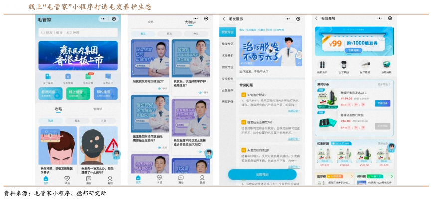 經(jīng)典案例:根據(jù)毛管家小程序、德邦研究所等綜合資訊表明,雍禾醫(yī)療公司積極推進(jìn)在線醫(yī)療服務(wù),已建立一支在線醫(yī)療團(tuán)隊(duì),在微信小程序上開發(fā)“毛管家”小程序,擁有超 81 萬名注冊用戶,可為患者進(jìn)行植發(fā)手術(shù)介紹、查詢醫(yī)生執(zhí)照及價(jià)格信息等,可實(shí)時(shí)上傳患者病歷等文件,從而提供便捷專業(yè)的在線咨詢、術(shù)后復(fù)查服務(wù)。