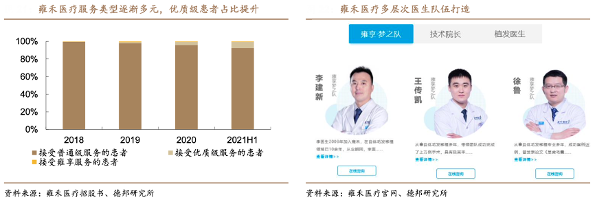 經(jīng)典案例:根據(jù)雍禾醫(yī)療招股書、雍禾醫(yī)療官網(wǎng)、德邦研究所等綜合資訊表明,雍禾醫(yī)療公司提供三級根據(jù)醫(yī)生經(jīng)驗及技能加以區(qū)分的植發(fā)醫(yī)療服務,包括:1)普通級服務:針對接 受標準植發(fā)手術的患者,收取人民幣 2 萬元至 3 萬元;2)優(yōu)質級服務:針對院長、主任或副主任進行升級和定制化植發(fā)手術的患者,收取 3 萬元至 5 萬元;3)貴賓級雍享服務:針對接受由業(yè)內知名植發(fā)專家進行個性化植發(fā)手術的患者,收取逾 10 萬元。