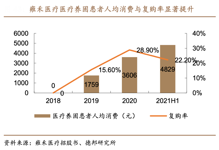 經(jīng)典案例:根據(jù)雍禾醫(yī)療招股書、德邦研究所等綜合資訊表明,以行業(yè)龍頭雍禾醫(yī)療為例,旗下的養(yǎng)固服務收入占比近年來逐漸提升,2020年醫(yī)療養(yǎng)固服務登記患者人數(shù)達 59122 人,人均消費由上年的 1759 元提升至 3606 元,復購率由 15.6%提升至 28.9%。