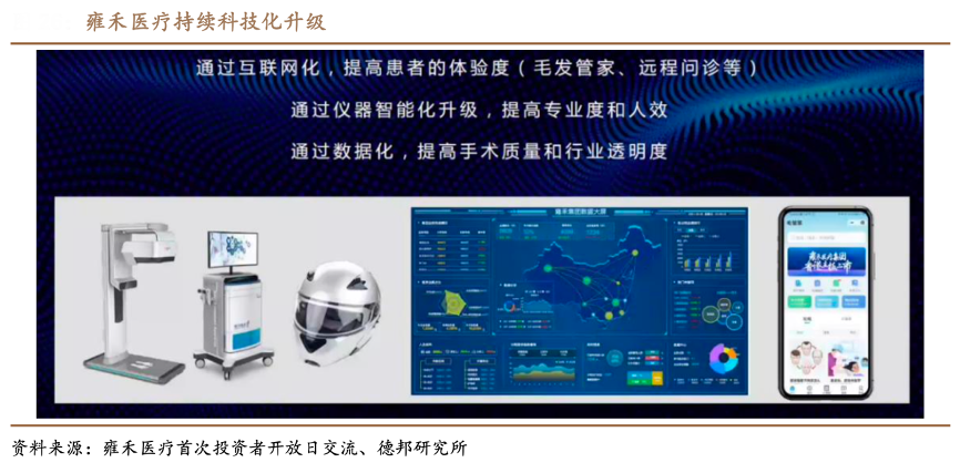 經(jīng)典案例:根據(jù)雍禾醫(yī)療首次投資者開放日交流、德邦研究所等綜合資訊表明,雍禾醫(yī)療公司建立先進的業(yè)務管理系統(tǒng)來追蹤、記錄展示全國醫(yī)療機構的運營數(shù)據(jù)。雍禾是首家建立數(shù)據(jù)分析 系統(tǒng)的民營毛發(fā)服務提供商,且是截止目前唯一一家可實時獲取患者人數(shù)、植發(fā)手術數(shù)量及毛囊移植數(shù)量資料的連鎖醫(yī)療機構。