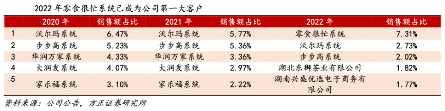 經(jīng)典案例:根據(jù)公司公告、方正證券研究所等綜合資訊表明,鹽津鋪?zhàn)庸韭氏炔季至闶硨I系統(tǒng),目前已與頭部品牌建立合作關(guān)系。公司于 2021 年與零食很忙達(dá)成合作,成為率先布局零食專營系統(tǒng)的上市公司品牌之一。目前公司在零食很忙的 SKU 已逐步拓展至約 40 多個(gè),涵蓋多個(gè)核心品類,并不斷上新品。2022 年,零食很忙已超越超越沃爾瑪成為公司第一大客戶,公司的報(bào)表端在零食很忙實(shí)現(xiàn) 2.11 億元的銷售額。