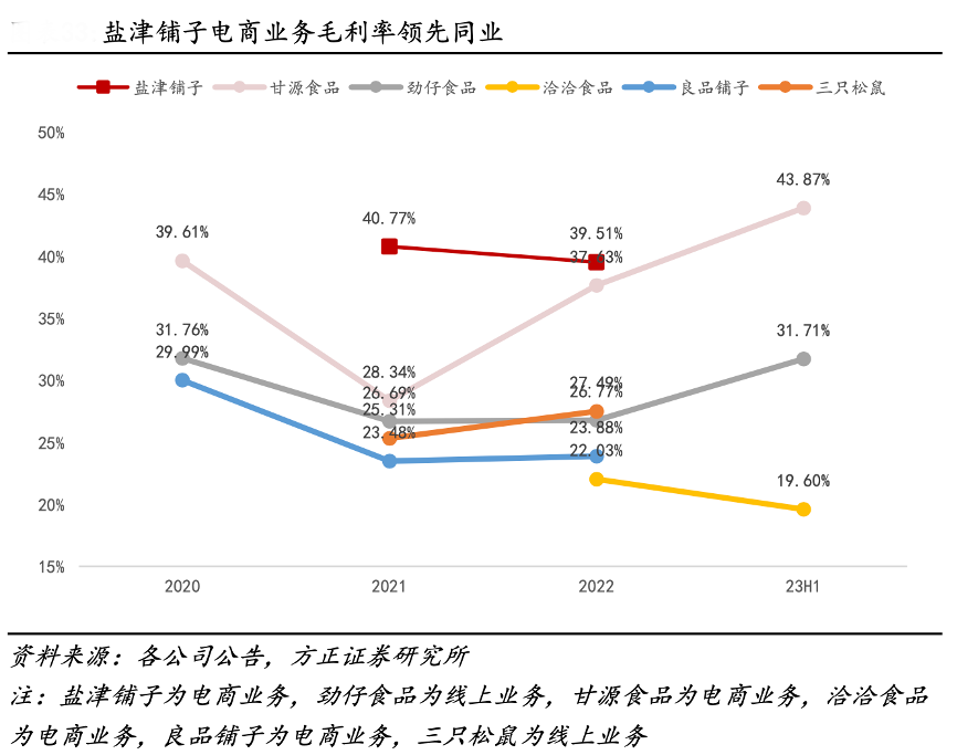 經(jīng)典案例:根據(jù)各公司公告、方正證券研究所等綜合資訊表明,鹽津鋪?zhàn)?nbsp;95%的產(chǎn)品均為自研自產(chǎn),通過長期生產(chǎn)經(jīng)驗(yàn)的不斷積累,積極引進(jìn)數(shù)字化賦能生產(chǎn),公司在供應(yīng)鏈方面具備核心優(yōu)勢,面臨線上平臺的激烈競爭,公司仍能保持較高的毛利率水平。2021/2022 年公司電商業(yè)務(wù)毛利率分別為 40.77%和 39.51%,在行業(yè)中處于領(lǐng)先地位。