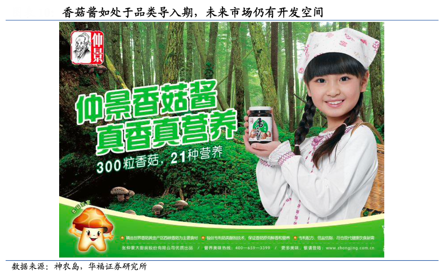 經(jīng)典案例:根據(jù)神農(nóng)島、華福證券研究所等綜合資訊表明,隨著消費(fèi)者健康意識覺醒、消費(fèi)代際更迭以及便 捷性需求的提升,香菇醬在全國仍具備滲透一定滲透空間。而且仲景食品是國內(nèi)首家研發(fā)出發(fā)酵型香菇醬、并成功實現(xiàn)市場化的公司,先發(fā)優(yōu)勢顯著;且根據(jù)全國連鎖店超市信息網(wǎng)的統(tǒng)計,2018 年仲景香菇醬在全國醬類的市場占有率為3.15%。