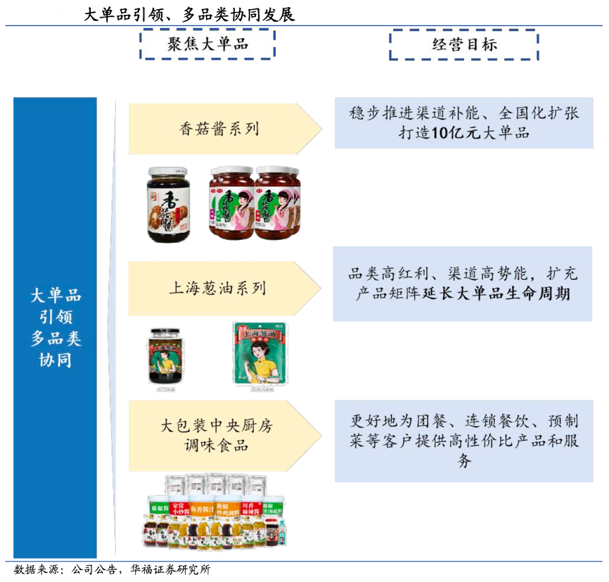 經(jīng)典案例:根據(jù)公司公告、華福證券研究所等綜合資訊表明,仲景食品公司踐行大單品引領、多品類協(xié)同發(fā)展的產(chǎn)品戰(zhàn)略,其中公司第一單品香菇醬仍具備區(qū)域拓展、渠道填補的空間,目標 10 億,而公司階段性快增預期基于上海蔥 油持續(xù)放量以及對線上渠道紅利的攫取,調(diào)配業(yè)務跟隨大 B 擴張同時固老開新,未來保持穩(wěn)健增長態(tài)勢。