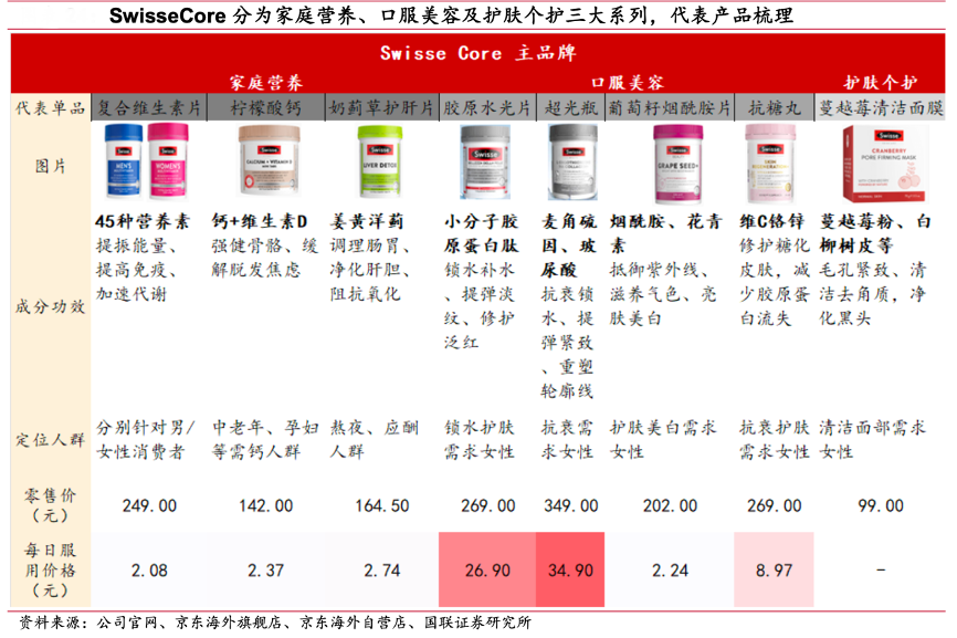經(jīng)典案例:根據(jù)公司官網(wǎng)、京東海外旗艦店、京東海外自營店、國聯(lián)證券研究所等綜合資訊表明,Swisse Core 分為家庭營養(yǎng)、口服美容及護(hù)膚個護(hù)三大系列,品牌內(nèi)部新老迭代明確。公司從家庭營養(yǎng)系列的膳食營養(yǎng)補(bǔ)充劑出發(fā),向口服美容方向如膠原水光片、超光瓶、美白丸及抗糖丸等產(chǎn)品以及護(hù)膚個護(hù)類面膜、磨砂膏及卸妝膏等新品類延展。