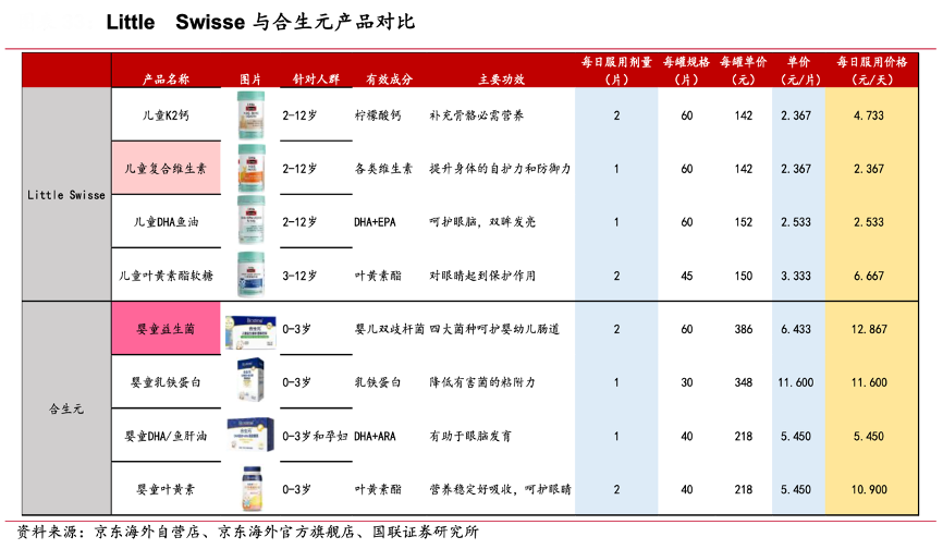 經(jīng)典案例:根據(jù)京東海外自營店、京東海外官方旗艦店、國聯(lián)證券研究所等綜合資訊表明,Little Swisse與和合生元產(chǎn)品功效性質(zhì)較為類似,主要為護眼、護腦及增強免疫力,而 Little Swisse 由于覆蓋兒童的年齡段更大,較合生元新增補鈣促進骨骼發(fā)育方面功效。