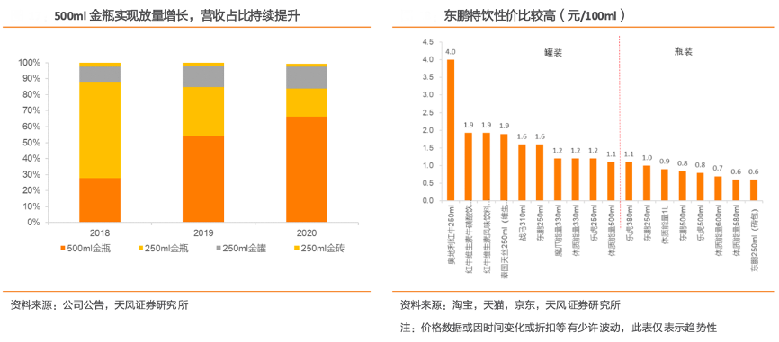 經(jīng)典案例:根據(jù)公司公告、淘寶、天貓、京東、天風證券研究所等綜合資訊表明,東鵬飲料差異化定價,價格帶向下兼容。公司推出 5 元/瓶的 500ml 大容量金瓶后,由于終端零售指導價格相較其他品類單位容量的價格更低,性價比更高,銷量迅速增長,500ml 金瓶也 迅速成為公司營收占比最高的單品。