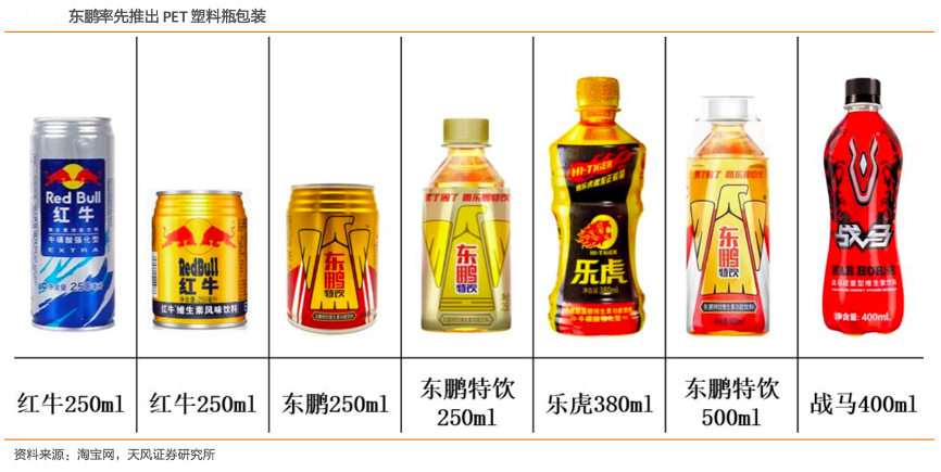 經(jīng)典案例:根據(jù)淘寶網(wǎng)、天風證券研究所等綜合資訊表明,2009 年東鵬公司首創(chuàng) PET 塑料瓶包裝和獨特的防塵 蓋專利設 計,以差 異化的產(chǎn)品包 裝在市 場中獨 樹一 幟,打破 了能量 飲料產(chǎn) 品罐裝 包裝的 市 場局限,迅速打開了市場,250ml 金瓶特飲也成為了公司高辨識度的經(jīng)典產(chǎn)品。2018 年,500ml 金瓶逐步在全國范圍內(nèi)上市,其成功填補了市場主要品牌在大容量能量飲料品類的缺口,滿足了消費者對于大容量產(chǎn)品的差異化需求。