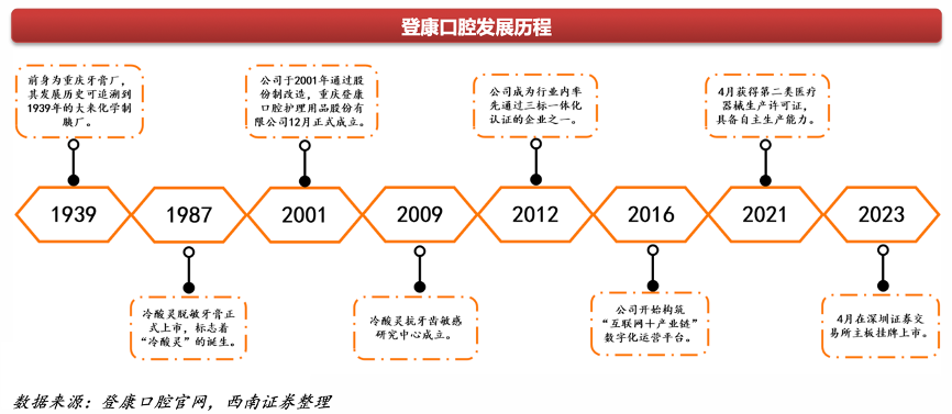 經(jīng)典案例:根據(jù)登康口腔官網(wǎng)、西南證券等綜合資訊表明,登康口腔前身為重慶牙膏廠,其發(fā)展歷史可追溯到1939年的大來(lái)化學(xué)制胰廠。2009年,公司成立冷酸靈抗牙齒敏感研究中心。2016年,公司開(kāi)始構(gòu)筑“互聯(lián)網(wǎng)+產(chǎn)業(yè)鏈”數(shù)字 化運(yùn)營(yíng)平臺(tái)。2023年,公司在深圳證券交易所主板掛牌上 市。
