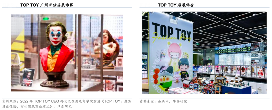 經(jīng)典案例:根據(jù)贏商網(wǎng)、2022年TOP TOY CEO孫元文在混沌商學(xué)院演講《TOP TOY:聚集場(chǎng)景體驗(yàn),重構(gòu)潮玩商業(yè)模式》、華泰研究等綜合資訊表明,TOP TOY 采用“店展結(jié)合”的模式,為消費(fèi)者提供復(fù)合的體驗(yàn)。店內(nèi)布局將消費(fèi)與展覽融 為一體,盲盒消費(fèi)區(qū)、非公開銷售的雕像區(qū)占據(jù)門店較大面積。以廣州正佳店為例,門店用 1/3 的黃金位置用于產(chǎn)品的展示而不做產(chǎn)品銷售,每個(gè)月進(jìn)行限量的全球的藝術(shù)品展覽,如蝙蝠俠、鋼鐵俠、小丑、火影忍者、海賊王等。從選址到門頭、設(shè)計(jì)、人流、導(dǎo)購服務(wù)、 陳列、打卡點(diǎn),TOP TOY 對(duì)門店各個(gè)環(huán)節(jié)進(jìn)行精心設(shè)計(jì)。