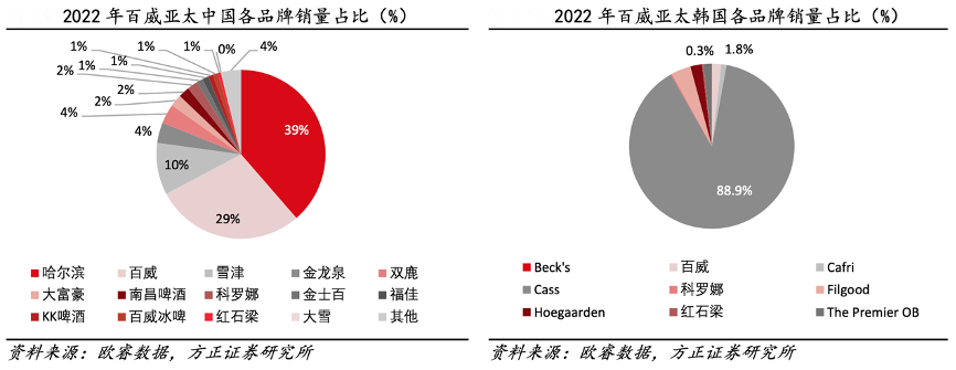經(jīng)典案例:根據(jù)歐睿數(shù)據(jù)、方正證券研究所等綜合資訊表明,百威亞太在品牌組合管理上,堅(jiān)持“國際品牌+當(dāng)?shù)貜?qiáng)勢品牌”的品牌戰(zhàn)略。其中,全球品牌“百威、科羅娜”等發(fā)力高端、超高端價(jià)格帶,進(jìn)行全國化拓展。本土品牌中:公司在中/韓/印三國分別確定了定位“核心/核心+價(jià)格帶”全國化推廣的主力品 牌,分別是:哈爾濱啤酒(中國,22 年銷量占比 39%)、CASS(韓國,22 年銷量占比 89%)、Haywards(印度,22 年銷量占比 40%)、Knock Out(印度, 22 年銷量占比 39%)。