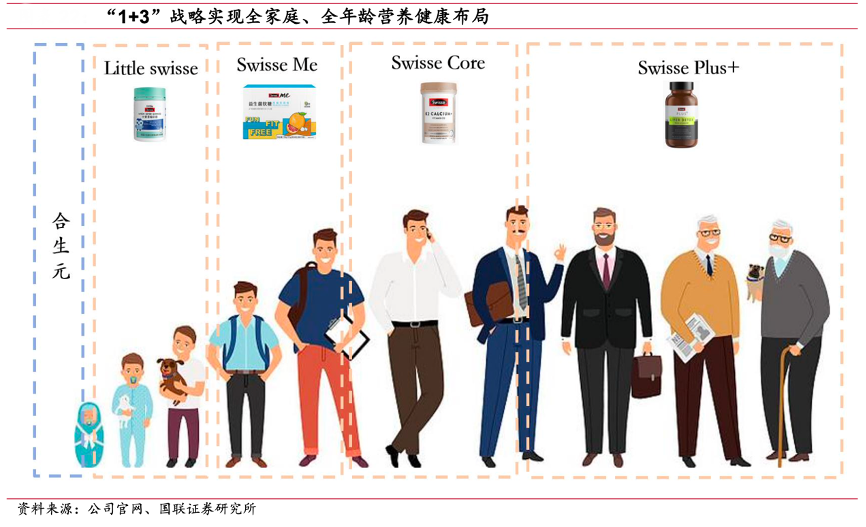 經(jīng)典案例:根據(jù)公司官網(wǎng)、國(guó)聯(lián)證券研究所等綜合資訊表明,H&H 控股于 2015 年收購(gòu)澳洲品牌 Swisse 進(jìn)軍成人營(yíng)養(yǎng)護(hù)理行業(yè),現(xiàn)已形成全家庭、全年齡營(yíng)養(yǎng)健康布局。“1+3”的品牌策略下,公司的成人營(yíng)養(yǎng)護(hù)理業(yè)務(wù)從 Swisse Core 主品牌出發(fā),上下延伸出三個(gè)子品牌 Swisse Plus+、Little Swisse 及 Swisse Me。其中Swisse Plus+主要針對(duì)35-50歲以上的成熟精英人群,用材高端、功效性強(qiáng);Swisse Me 針對(duì) 25 歲以下的年輕族群,產(chǎn)品以軟糖及直飲粉劑等創(chuàng)新劑型為主,口味豐富、便于攜帶、即食性強(qiáng)。