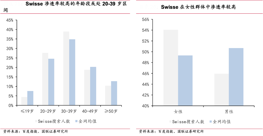 經(jīng)典案例:根據(jù)百度指數(shù)、國(guó)聯(lián)證券研究所等綜合資訊表明, Swisse主要客群畫像或?yàn)?20-39 歲區(qū)間女性消費(fèi)者,口服美容系列貼近主要客群需求,產(chǎn)品定位上更細(xì)分,如鎖水補(bǔ)水的“水光瓶”、打造輪廓線的“超光瓶等,終端表現(xiàn)較為突出,23Q4上市的超光瓶在 2023 年雙十一期間 GMV 高達(dá) 776 萬(wàn),超光瓶、膠原水光瓶銷量位居全平臺(tái)第一。