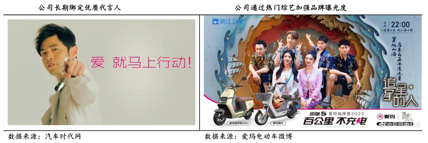經(jīng)典案例:根據(jù)汽車時(shí)代網(wǎng)、愛(ài)瑪電動(dòng)車微博、國(guó)泰君安證券研究等綜合資訊表明,愛(ài)瑪自 2009 年起深度綁定周杰倫作為品牌代言人,彰顯公司品質(zhì)如一的可 靠形象。同時(shí),愛(ài)瑪自 2021 年起開(kāi)啟多樣化廣告投放,在線下全方位滲透消費(fèi)者的出行場(chǎng)景,包括高鐵廣告、社區(qū)廣告以及地鐵廣告等,2023 年通過(guò)攜手《披荊斬棘 3》、《乘風(fēng) 2023》、《青春飛一般》、《追星星的人》等頂流綜藝,實(shí)現(xiàn)“產(chǎn)品露出+明星效應(yīng)+品牌價(jià)值+銷 量轉(zhuǎn)化”的全維共贏。