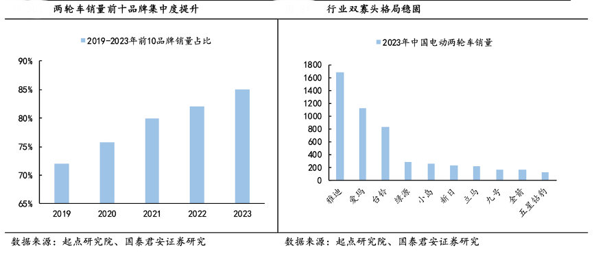 經(jīng)典案例:根據(jù)起點(diǎn)研究院、國泰君安證券研究等綜合資訊表明,兩輪車行業(yè)寡頭格局穩(wěn)固,新銳品牌通過差異化提升市場(chǎng)份額。從行業(yè)競(jìng)爭(zhēng)格局來看,市場(chǎng)集中度較高,CR5 從 2019 年的 49%上升至 2021 年的 69%。 其中,雅迪和愛瑪雙寡頭格局穩(wěn)固,2021年兩家企業(yè)合計(jì)占據(jù)了 45%的 市場(chǎng)份額。從競(jìng)爭(zhēng)策略角度,雅迪和愛瑪在多年積累下,口碑和客戶基礎(chǔ)更加穩(wěn)定,定位相對(duì)中低端,注重產(chǎn)品的實(shí)用性和可靠性。