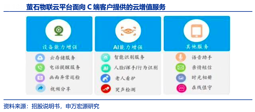 經(jīng)典案例:根據(jù)招股說明書、申萬宏源研究等綜合資訊表明,螢石基于強大的云平臺能力,形成“優(yōu)質(zhì)產(chǎn)品引流——積累用戶基數(shù)——增值服務(wù)帶來高毛利”的商業(yè)模式,構(gòu)成正反饋循環(huán)。對比其他競爭對手,形成價值周期更長的盈利模式;以視覺能力為特色,滿足用戶多元化需求,具備獨特優(yōu)勢。