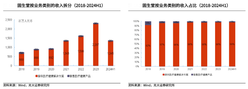 經(jīng)典案例:根據(jù)wind、光大證券研究所等綜合資訊表明,固生堂主要業(yè)務(wù)分為醫(yī)療健康解決方案和銷售醫(yī)療健康產(chǎn)品兩大板塊,其中醫(yī)療健康解決方案為收入主要來源。醫(yī)療健康解決方案服務(wù)包括提供診前準(zhǔn)備、優(yōu)質(zhì)的問診與診斷、理療、中醫(yī)處方及煎藥服務(wù)。提供醫(yī)療健康解決方案的收入占比由 2018 年的 92%提升至 2024H1 的 99%,呈逐年提升趨勢(shì)。
