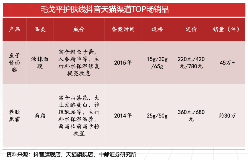 經典案例:根據(jù)抖音旗艦店、天貓旗艦店、中郵證券研究所等綜合資訊表明,毛戈平公司線上采用小規(guī)格單品迅速拉新,線下通過組合裝提升折扣方式提升彩妝對護膚連帶,實現(xiàn)護膚品健康增長。根據(jù)抖音、天貓旗艦店,24M1-11護膚品類中涂抹面膜、面霜累計銷售70萬余件,占據(jù)該品牌護膚品類絕大份額,單品集中度高;截止24H1,奢華魚子醬面膜單品實現(xiàn)零售額4.5億元。