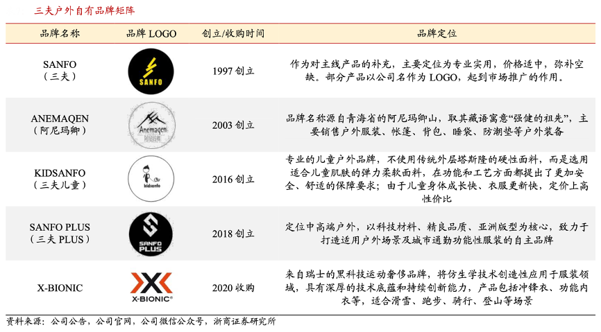 經(jīng)典案例:根據(jù)公司公告、公司官網(wǎng)、公司微信公眾號(hào)、浙商證券研究所等綜合資訊表明,三夫戶外公司在 2015 年上市前就有兩個(gè)自有品牌 SANFO(三夫)、ANEMAQEN(阿尼瑪卿),作為對(duì)主線經(jīng)銷產(chǎn)品的補(bǔ)充,定位專業(yè)適 用、價(jià)格適中,其中部分產(chǎn)品以公司名作為 LOGO,起到市場(chǎng)推廣的作用。上市后,公司 在 2016 年推出 KIDSANFO(三夫兒童),以順應(yīng)二胎政策和家庭戶外游趨勢(shì);后又在 2018 年推出 SANFO PLUS(三夫 PLUS),定位中高端,以科技材料、亞洲版型為核心,共推出四個(gè)系列。