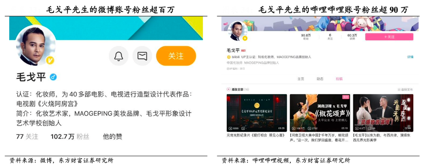經(jīng)典案例:根據(jù)微博、嗶哩嗶哩視頻、東方財富證券研究所等綜合資訊表明,品牌創(chuàng)始人毛戈平先生在行業(yè)內(nèi)具備廣泛影響力。毛戈平先生創(chuàng)造了多個深入人心的影視妝面,在行業(yè)內(nèi)數(shù)十年的積累也構(gòu)建了創(chuàng)始人在彩妝領(lǐng)域廣泛的影響力,在社媒平臺上也積累了一定體量的粉絲,毛戈平先生在微博/嗶哩嗶哩平臺賬號分別有 102.7/90.8 萬粉絲,足見創(chuàng)始人自身的影響力。