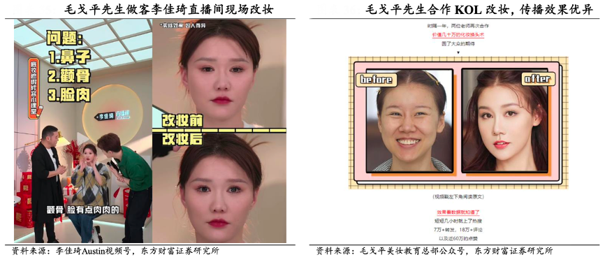 經(jīng)典案例:根據(jù)李佳琦Austin視頻號、毛戈平美妝教育總部公眾號、東方財富證券研究所等綜合資訊表明,品牌創(chuàng)始人毛戈平先生與社媒平臺、電商平臺 KOL 合作進行改妝教學,根據(jù)不同改妝模特的面部情況以及改妝訴求針對性提出優(yōu)化建議,通過輕微的修改調(diào)整達到揚長避短的優(yōu)化效果,深化消費者對于創(chuàng)始人化妝技術(shù)以及理念的認可,以高專業(yè)度提升消費者對于毛戈平品牌產(chǎn)品的信任度。