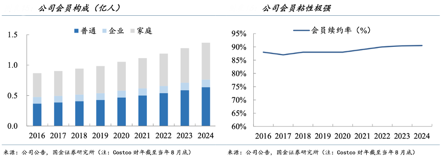 經(jīng)典案例:根據(jù)公司公告、國(guó)金證券研究所等綜合資訊表明,2024財(cái)年Costco公司全球范圍內(nèi)普通、企業(yè)會(huì)員合計(jì)約 0.76 億人,產(chǎn)生出 0.61 億家庭卡會(huì)員,派生比例約為 1:0.8,全球會(huì)員總數(shù)達(dá)到 1.37 億人。并且這部分會(huì)員的消費(fèi)粘性極強(qiáng),養(yǎng)成消費(fèi)習(xí)慣后形成路徑依賴,滾動(dòng)會(huì)員續(xù)約率長(zhǎng)期維持在接近 90%的水平,構(gòu)成公司的堅(jiān)實(shí)壁壘。