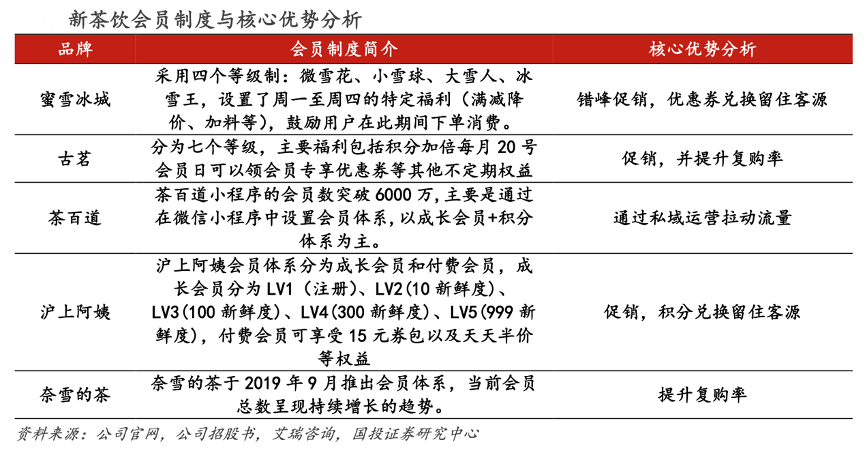 經(jīng)典案例:根據(jù)公司官網(wǎng)、公司招股書、艾瑞咨詢、國投證券研究中心等綜合資訊表明,五家茶飲企業(yè)均采用會員制的方式進(jìn)行客戶留存,以提升新客轉(zhuǎn)化率。會員制的核心目在于,通過積分的方式推進(jìn)復(fù)購率的提升,推動老客群體的多次消費;同時以會員制形成一個較好的渠道,從而使得新茶飲企業(yè)利用新媒體進(jìn)行更多的私域流量引流。
