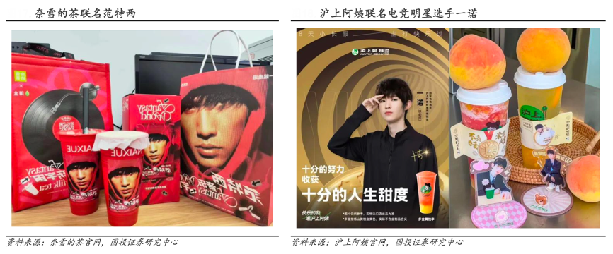 經(jīng)典案例:根據(jù)奈雪的茶官網(wǎng)、滬上阿姨官網(wǎng)、國投證券研究中心等綜合資訊表明,2023 年 9 月,在周杰倫《范特西》專輯發(fā)行 22 周年之際,奈雪的茶聯(lián)名薄盒上線范特西音樂宇宙系列聯(lián)名產(chǎn)品,同時還推出了 CD 造型的杯墊、印有周杰倫專輯封面的不銹鋼杯子和手提袋,引發(fā)了一波打卡熱潮。在 2023 年 亞運會開幕前夕,滬上阿姨就邀請了一諾擔(dān)任鮮果茶體驗官,消息已經(jīng)發(fā)出一度刷屏了電競愛好者的社交媒體。