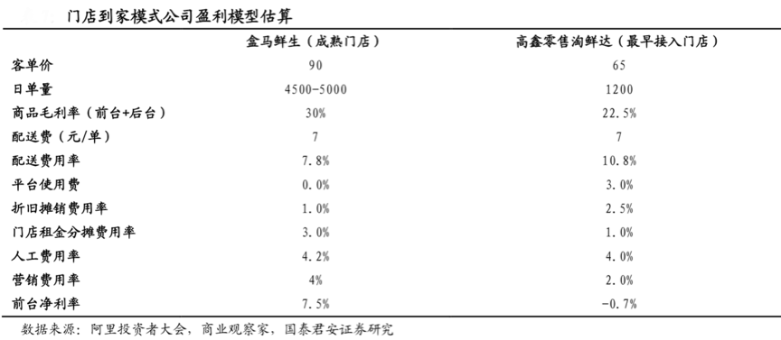 根據(jù)阿里投資者大會(huì)、商業(yè)觀察家、國泰君安證券研究等綜合資訊表明,從“門店到家”模式盈利來看,以盒馬鮮生為代表的門店經(jīng)營,其大部分的商品毛利率控制在30%左右,而其大量的人工費(fèi)用、營銷費(fèi)用等保持“可控性支出”,“品類毛利控制”是此類新零售模式策劃運(yùn)營的核心所在。