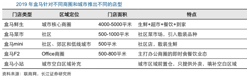 優(yōu)布局。對(duì)生鮮新零售“門店到家”強(qiáng)化網(wǎng)點(diǎn)布局,優(yōu)化網(wǎng)點(diǎn)設(shè)計(jì)及多網(wǎng)點(diǎn)協(xié)同操作,提升網(wǎng)點(diǎn)的物流配送能力及門店物品配送效率,強(qiáng)化網(wǎng)點(diǎn)的品類優(yōu)化價(jià)值,亮化生鮮門店網(wǎng)點(diǎn)訂單配送、社區(qū)維護(hù)、品類消費(fèi)指導(dǎo)等價(jià)值。根據(jù)聯(lián)商網(wǎng)、長江證券研究等綜合資訊表明,盒馬在2019年提出了對(duì)其模式的5個(gè)思考,并提出了5種店型,可見其特色。
